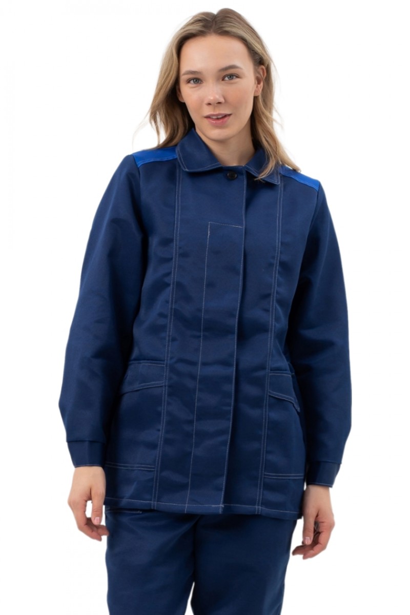 ➠ Куртка прямая, с центральной бортовой супатной застежкой на петли и пуговицы. Воротник отложной. Полочки с рельефами. Два нижних накладных кармана с фигурными клапанами. Левый нагрудный карман с отделением для ручки. Рукава с манжетами, застегивающимися на пуговицу. В области талии кулиса со шнуром и фиксатором.